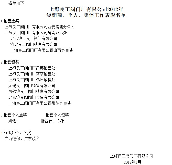 本次會議就2011年的工作和2012年的發(fā)展和目標,由總經理郭瑋明作了重點講話,有關領導也就各人的工作作了發(fā)言。林金鏢董事長也作了重要講話,上海良工閥門廠近年來經濟運行是快速發(fā)展的景象,2011年度的實現(xiàn)銷售指標比2010年的遞增了50%,達到了歷史最好水平。這一成績的實現(xiàn),是與公司上下一致團結努力分不開的,是與全國銷售代理商的努力分不開的。3月17日下午會議分三大塊進行了深入的討論,就大會的要求和相關文件、政策,以及新一年的目標和打算,分組會議討論熱烈、歡暢,紛紛表示堅決擁護公司的發(fā)展政策,做好自己的本職工作,要再接再厲完成好公司2012年度的方針、目標。各駐外銷售代理商也感謝上海良工在新的年度銷售政策上給予的支持,紛紛積極主動簽訂了2012年度的銷售協(xié)議,爭取更好、更多地完成銷售任務,將上海良工的“工”字牌商標閥門產品進一步做大做強,認真地服務于全國的客戶群,使上海良工的“工”字牌著名商標閥門產品永遠走在行業(yè)的前列,為國家各行各業(yè)的發(fā)展貢獻自己的力量。會議經過三天的學習、討論、簽約,完成了各項議程,于3月18日圓滿結束,并對榮獲金牌、銀牌的代理商和公司本部營銷人員進行了表彰、授牌。